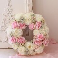 こちらはピンク&ホワイトのローズにベリーやレースフラワーをあしらったロマンティックなリース 発砲スチロールのベースを使用した軽量な作りです 大きさも程よくあり、壁面に素敵な彩を添えてくれますよ