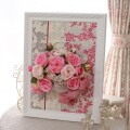 こちらは額縁に立体的にアレンジしたフレームアレンジ 背面にフランス製の生地をあしらい、バラ・紫陽花・スノーボールを使用しています
