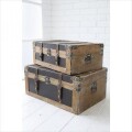 木製のビンテージ風トランクボックス アンティークスタイルにトランクボックスは欠かせない定番アイテムです 生活感がでてしまう書籍や、細々とした雑貨類を収納して隠すことができます そのままお部屋の一角で飾ればインテリアがぐっと引き締まり、アンティークな空間を楽しめます ダークなカラーテイストとベルトの凝ったデザイン、丁寧に施されたアンティーク加工は重厚感があります