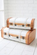 丸みのある可愛らしいフォルムのトランクボックス サイズ違いの2点セットです ホワイトを基調にキャメルの色合いがおしゃれな雰囲気です 日用品やコレクション小物などの収納におすすめです |