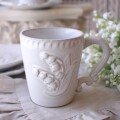 こちらは手にほっこりと馴染むマグカップ 持ち手の形状やふちのエンボス仕上げが温もりを感じます