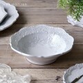こちらはレース模様の美しいメルレットシリーズ 小ぶりなサイズ感のボウルです サラダやフルーツ、スープやシリアルなど用途が幅広くおすすめです シリーズでコーディネートしてもお楽しみ下さい |