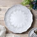 こちらはレース模様の美しいメルレットシリーズ アンダープレートにもなるフラットなプレートです カフェ風のワンプレートとして、またホールケーキなどのデザートプレートやパーティーのメイン料理のプレートなど幅広くお使い頂けます |