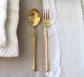 マットなゴールドのお色や、シンプルなディテールは輸入品ならではのお品です 軽すぎず適度な重みが手に馴染みも良いです ステンレス製ですので錆びず、くすまず、お手入れも簡単です シリーズのディナーカトラリー、バターナイフもございます