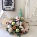 色とりどりのオーナメント、2種類のリボン、ピンクのプレゼントボックス、松ぼっくりなど沢山装飾した、ラグジュアリで華やかなデコレーションオブジェです