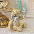 明るいゴールドとシルバーカラーのかわいいテディベアのクリスマスオーナメント 首には大きなリボンを飾り、手には星を持ってこちらを見上げています