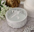 こちらはガラス蓋付きのジュエリーケース 2サイズ展開で小さい方のサイズです アンティーク風仕上げの色合いに、側面のハートレース模様や蓋のクリスタル付きリボンなど細かな装飾が目を惹きます