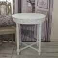 こちらは装飾の美しいホワイトカラーのラウンドテーブル 手の込んだアンティーク塗装は、色の剥がしや擦れなどが再現されて味わい深い雰囲気です 小ぶりなサイズ感は椅子と合わせてコーヒーテーブルのように使ったり、飾り台のように使用しても素敵です |