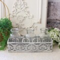 こちらは紋章モチーフが施されたアイアン装飾に、小ぶりなガラスベースが3点セットされたフラワーベース 丁寧なアンティーク仕上げ塗装が施されシャビーな雰囲気は、お庭で摘んだ季節のお花やグリーン、アートフラワー(造花)などを引き立てます