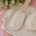 こちらは可愛い香りのオブジェ センティッドデコ オーバルプレートにラベンダーの花束がデザインされ、ベビーピンクのグログランリボンがあしらわれています