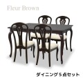 シックで上品なブラウン塗装はフレンチクラシックでお部屋にも合わせやすく飽きがこないカラー 重厚でしっかりとした作りは末永くご愛用頂けるお品です ※こちらは4人掛けのダイニングテーブルとダイニングチェア4脚のセット販売となります (ダイニングテーブルは天板模様張り仕様です)