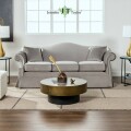 アメリカの人気ブランド、ジェニファーテイラー社製の三人掛けソファ 光沢感のある明るいグレーのベロア生地で茶系・白系どちらの家具にも合わせやすい色合いです